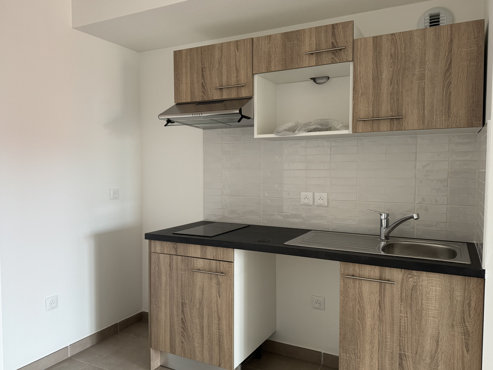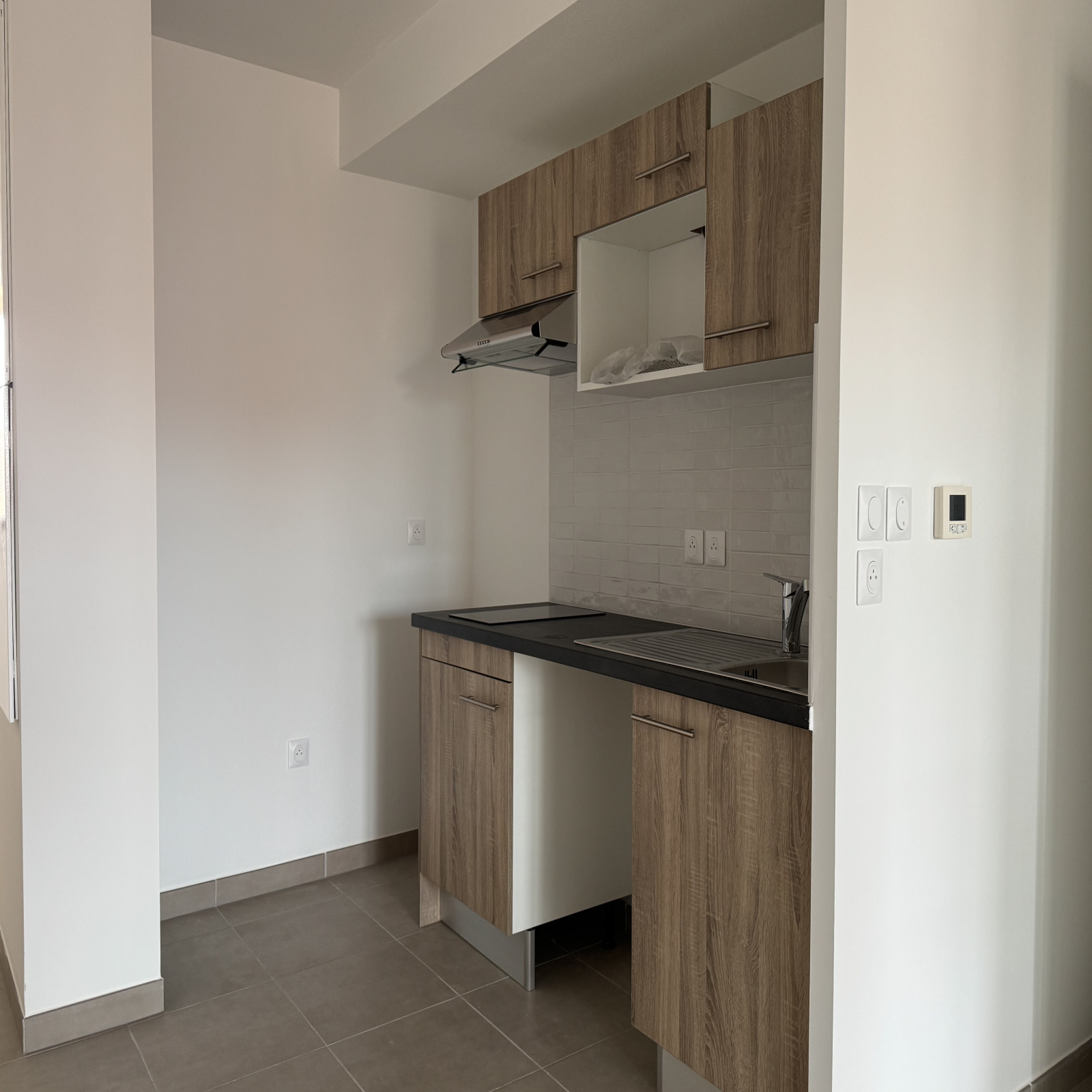 Une cuisine moderne équipée d’une plaque vitrocéramique 2 feux et d’une hotte, avec emplacements intégrés pour four et lave-vaisselle